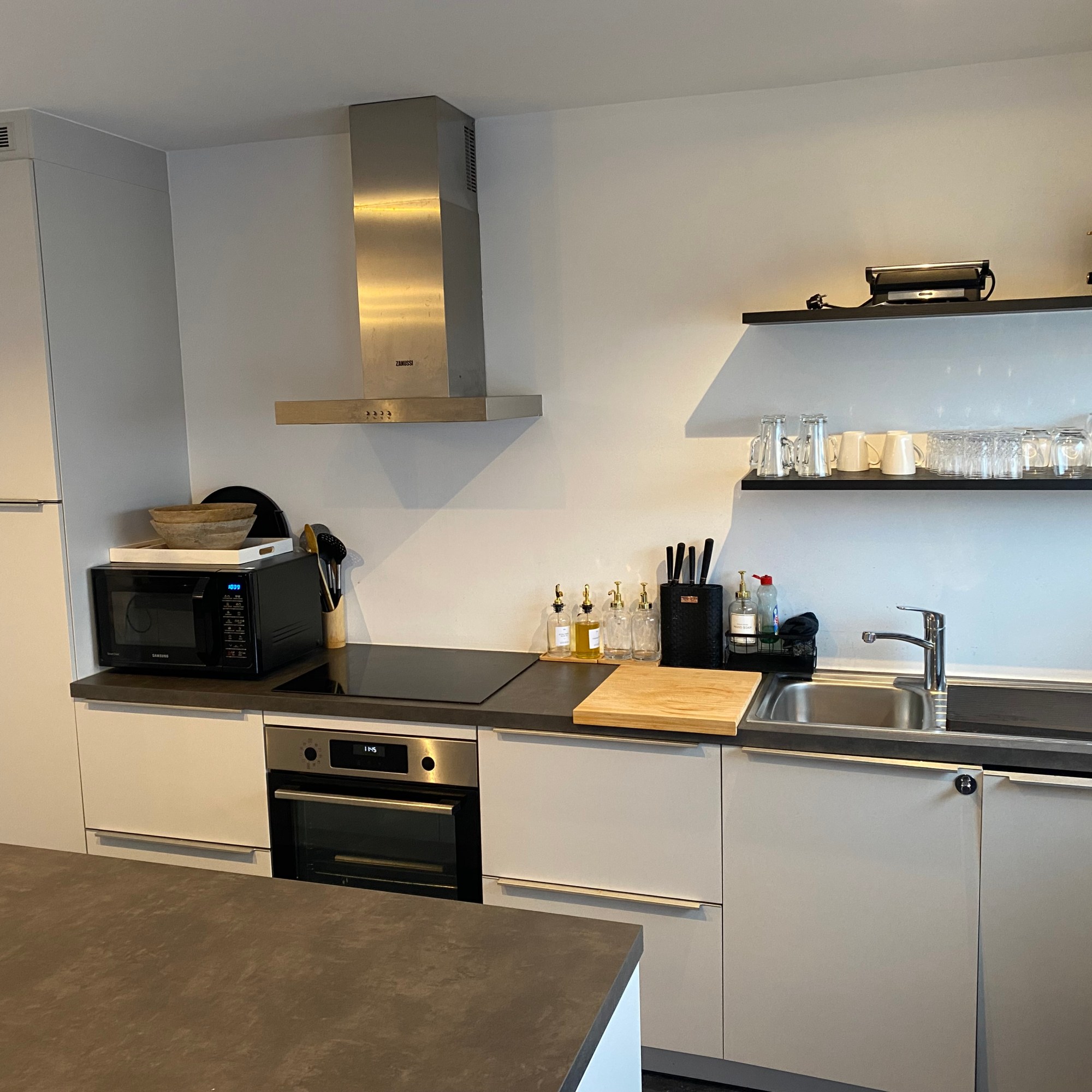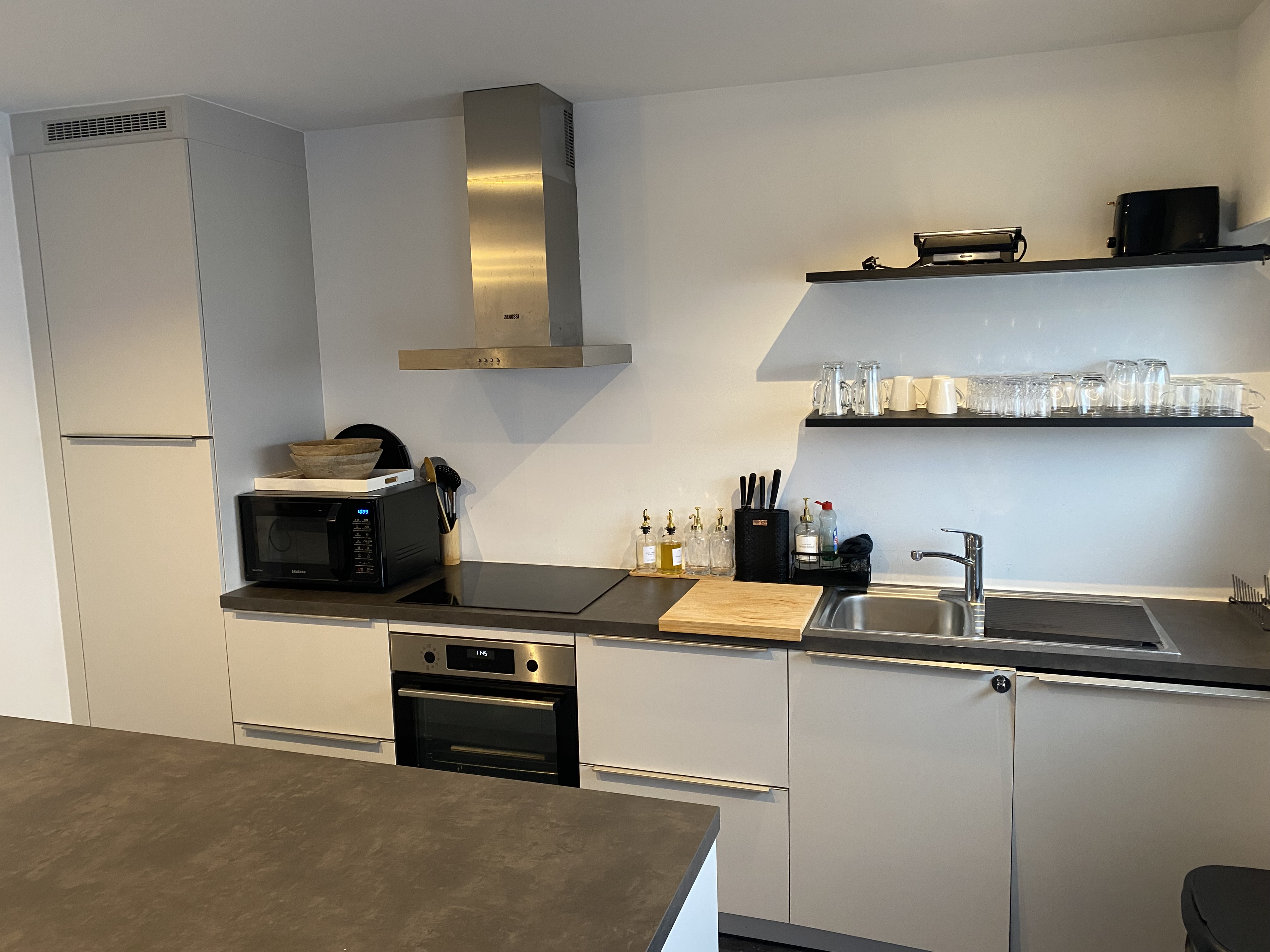 Ruime woonkamer, een open ingerichte keuken met ingebouwde vaatwas, kookplaat, oven, dampkamp en koelkast